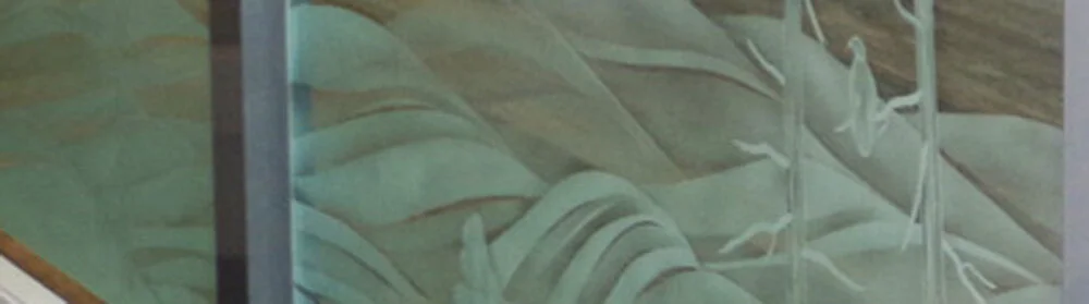 There are three glass panels in this railing - an end panel and two side panels. Annette and her husband sail and love the water, so they wanted water on these glass panels. In part also to balance against a painting she had made and hung on the wall above the stairs. To my mind water is something in the background behind whatever you choose for the design. To make it easier on myself I brought in some trees and some orca fins. But the main motif on this handrail is water.