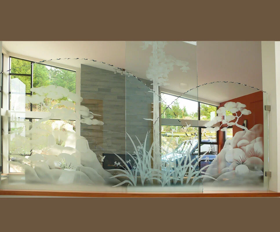 Glass has become a common building material. It is strong and durable, it does not block light and it can create the feeling of open space. But often the opening with glass looks empty. It opens the view indiscriminately from inside out and from outside in. With sandblasting it is possible to create privacy, to block the views you don’t want, or to frame the part of a view you particularly enjoy.