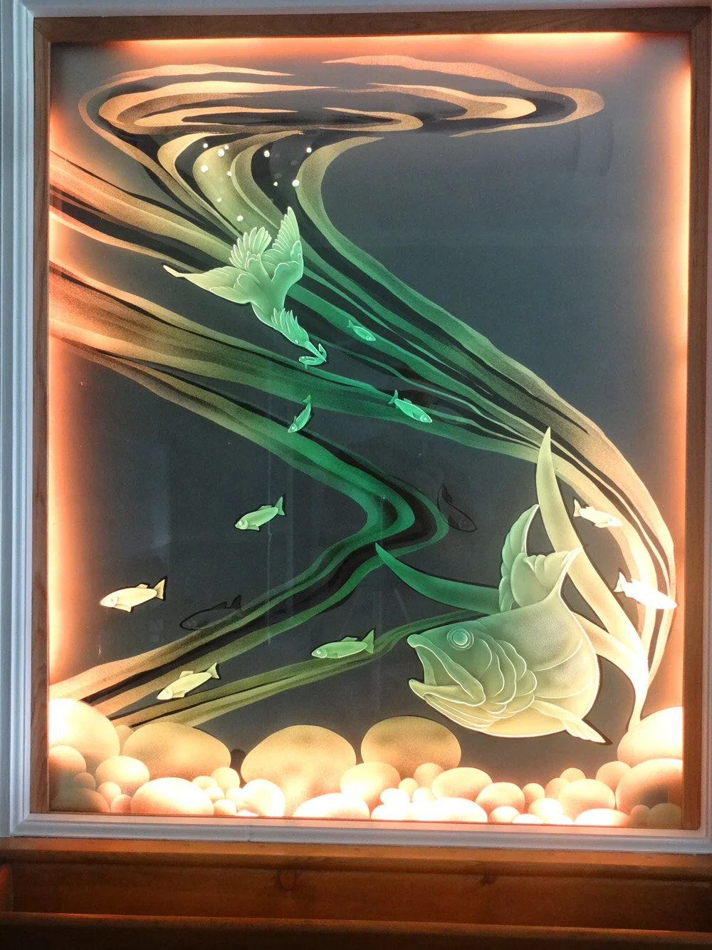 Sometimes people forget that mirrors are also glass. They are different to work on than clear glass, and they offer different possibilities. Mirrors add a feel of space to an enclosed area, even when the mirror is sandblasted. And of course it is possible to frame a functional mirror with sandblasting. (Mirrors are even more difficult to photograph than regular glass, so I only have very few pictures of them).