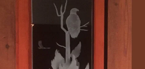 Hendrik Blok wanted a design on the sidelight by his front door because the clear glass made the family feel exposed to the eyes of people coming to the door. He had a picture of a tree on his property which he figured would make a suitable subject for the design. The sidelight window is a sealed unit. I did the tree design on both pieces of glass in the unit, it gave more depth to the image.